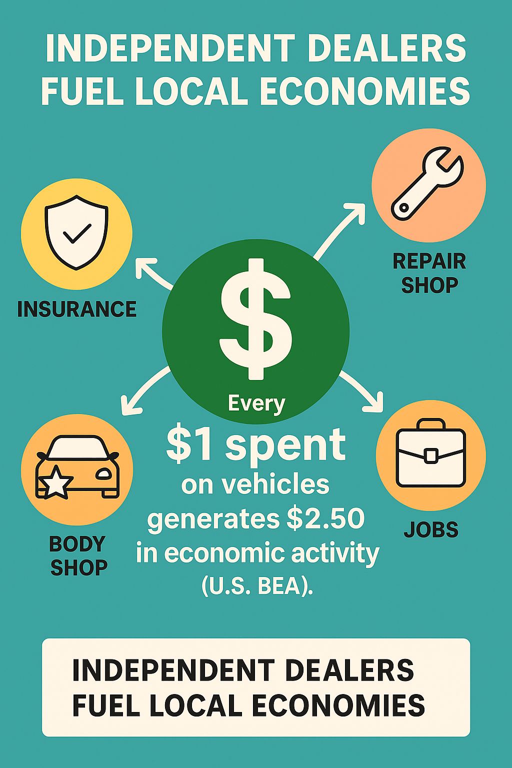The U.S. Bureau of Economic Analysis estimates that every $1 spent on vehicle sales generates $2.50 in economic activity. That ripple spreads through communities nationwide.